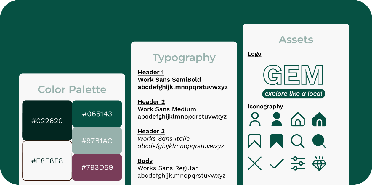 GEM's visual identity is understated and grounded in order to let destinations take center stage rather than compete with the UI around them.