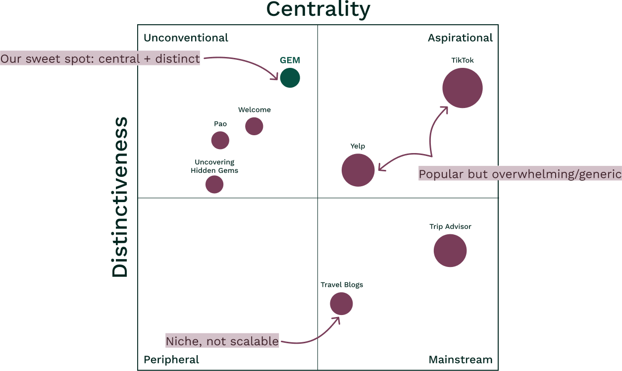 GEM was positioned in the Unconventional + Central quadrant: mainstream enough to be easy to use, distinctive enough to surface genuinely local recommendations.