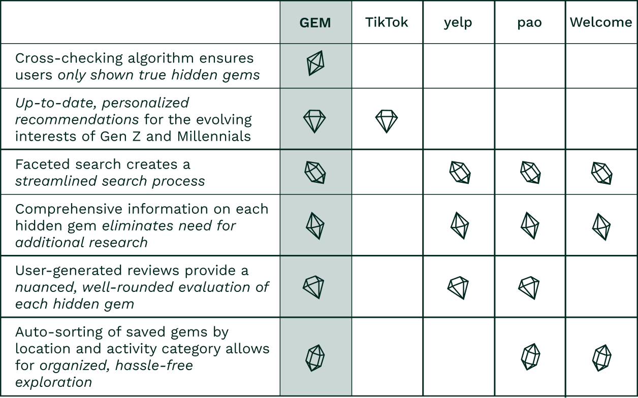 A feature comparison reinforced the gap. TikTok and Yelp win on reach, but neither offers streamlined search, reliable filters, or any cross-verification of recommendations. GEM's differentiators — a cross-checking algorithm, faceted search, and auto-sorting — directly address the manual research burden users described in interviews.