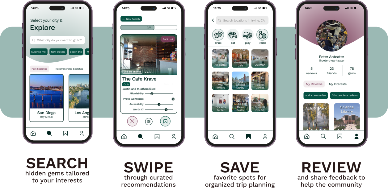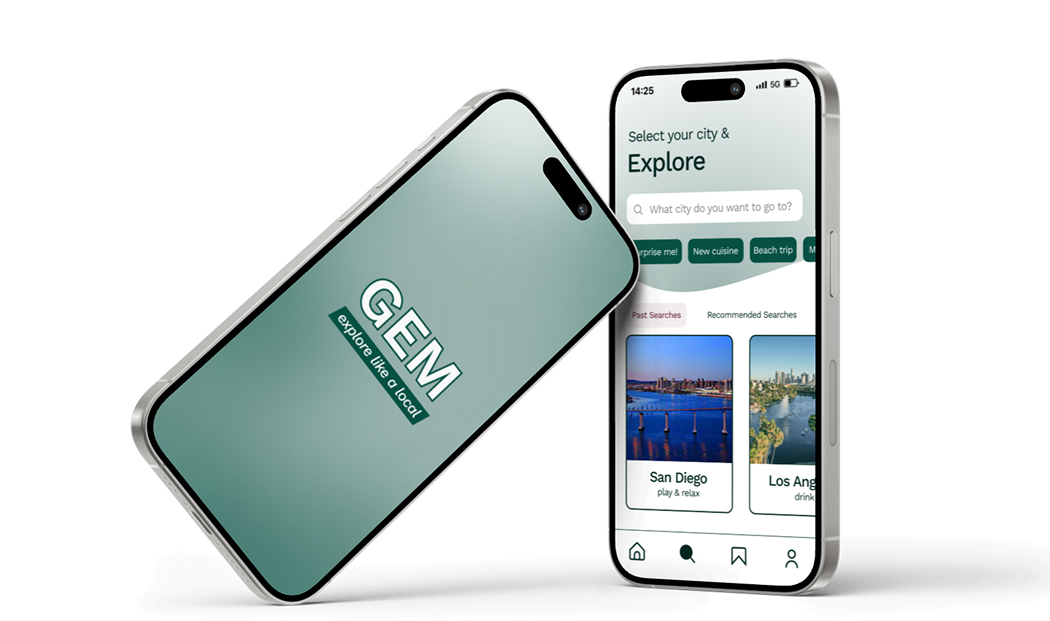 GEM is a travel discovery app I designed as part of a cross-functional fellowship through Product Association @ UCI. As the sole designer on the team, I owned the full design process — from initial research synthesis and wireframing through two rounds of usability testing and the final high-fidelity prototype. The final product is GEM, a travel discovery app that helps young adults find hidden local gems tailored to their interests, cutting through the noise of social media and overcrowded review platforms to surface experiences that actually feel special.