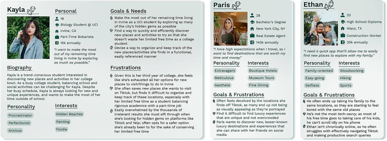 To understand who we were designing for, we synthesized the interview findings into three personas representing the core range of GEM users, from the frequent weekend explorer to the spontaneous traveler landing somewhere new.