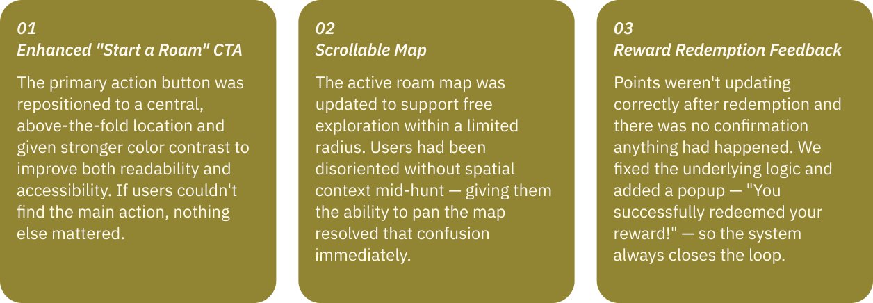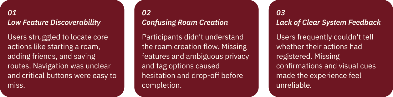 Features we thought were obvious, such as reward redemption, roam creation, needed significant rethinking once real users got their hands on the prototype. Usability testing didn't just surface bugs; it changed our understanding of the product's hierarchy entirely. What felt logical to us as designers was invisible to someone encountering the app for the first time.