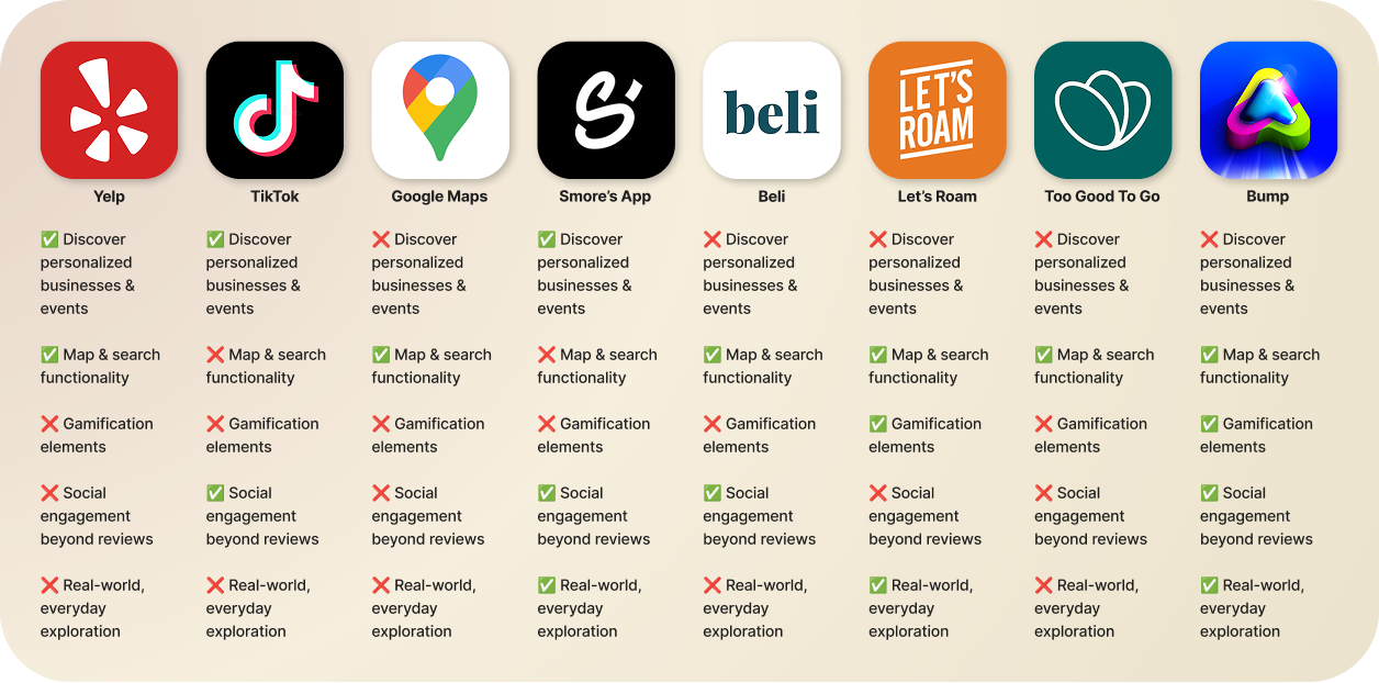 We mapped eight competitors, Telp, TikTok, Google Maps, Smore's App, Beli, Let's Roam, Too Good To Go, and Bump, against five criteria: personalized discovery, map functionality, gamification, social engagement beyond reviews, and real-world everyday exploration.