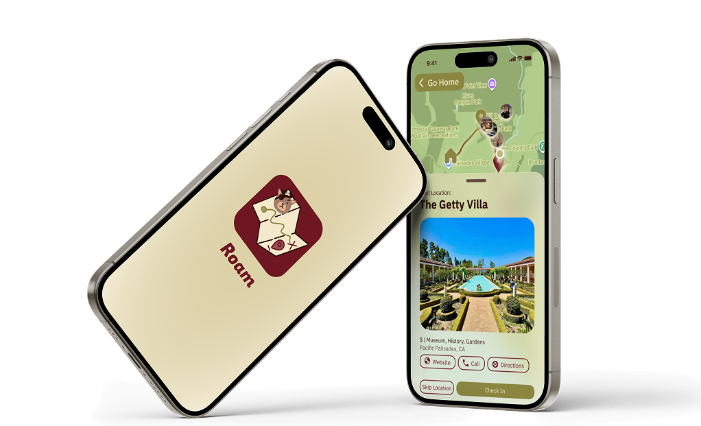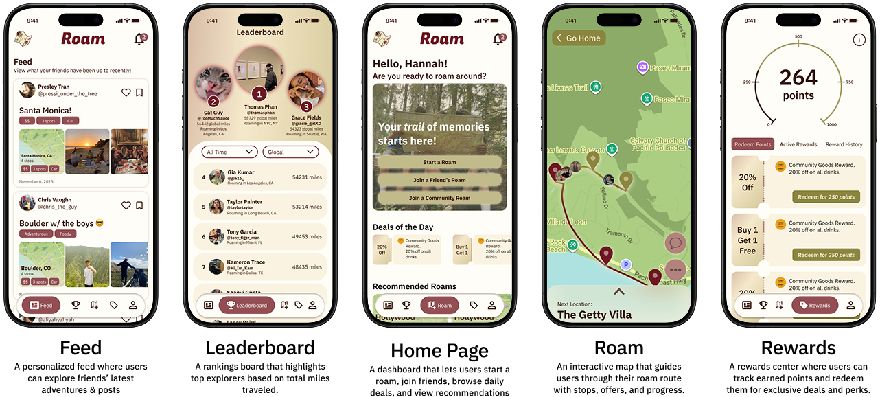 Roam is a scavenger-hunt style exploration app that turns everyday outings into guided adventures. Users create or join "roams" — customizable, bite-sized routes through their city — then earn points, share experiences with friends, and discover local spots they'd never find on their own. As design lead, I guided the team's design direction, established the shared design system that allowed us to work in parallel, and led all usability testing. Individual sections were wireframed collaboratively, with each designer owning a core flow before we reconciled everything into a unified system.