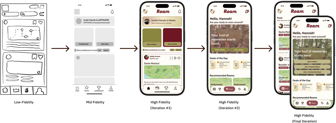 The home screen shows the most visible evolution across the project. It moved from a rough sketch through a mid-fi wireframe with placeholders, then a first high-fidelity pass that introduced branding but conflated two distinct user needs, discovery and social, into a single cluttered screen. The second iteration made the most significant structural change: splitting the home screen into two separate pages. The Roam page became focused purely on starting and joining roams, while the Feed became its own dedicated space for social activity. This separation clarified the product's hierarchy and gave each mode room to breathe. The final version refined the Roam page further with the drawer layout, making the primary CTA impossible to miss while keeping recommended roams and daily deals within reach.