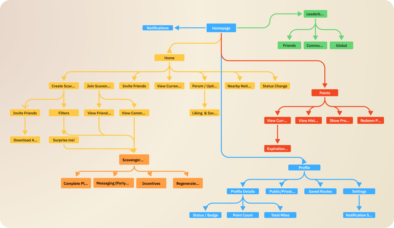 The IA is organized around five main pillars accessible from the homepage: Home, Leaderboard, Profile, Notifications, and Points/Rewards. Home houses the core user flow — creating roams, joining friends, browsing community routes, and accessing nearby notifications. The active Scavenger Hunt experience lives nested within Home as the primary action. Leaderboard branches into Friends, Community/County, and Global views. Profile covers identity, saved routes, and settings.
