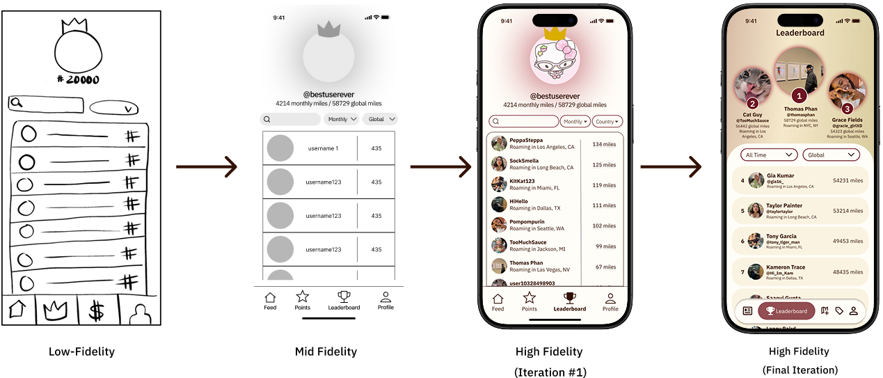 We moved through three fidelity stages: low-fi sketches to explore layout, mid-fidelity grayscale frames to establish structure, and multiple high-fidelity rounds where branding and real content were introduced. Each major section — Feed, Profile, Scavenger Hunt, Leaderboard, Points — was wireframed by individual team members working from the shared IA, then reconciled through a shared design system I established.