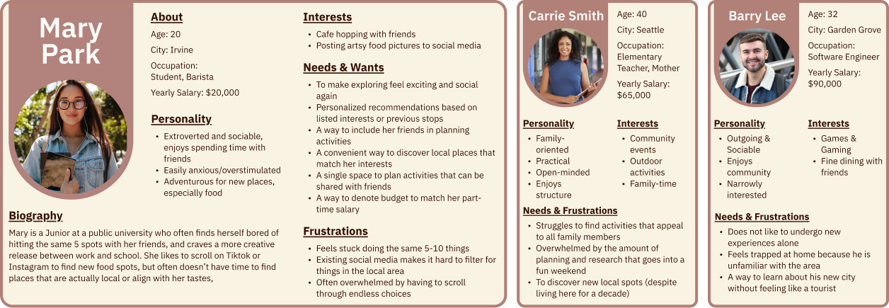 Roam is for people who feel stuck in routine and want an easier, more exciting way to discover what's around them. We developed three personas to capture the range of users, from the college student bored of the same five spots, to the mother of three trying to plan a weekend everyone will actually enjoy, to the new-to-town software engineer who doesn't want to feel like a tourist.
