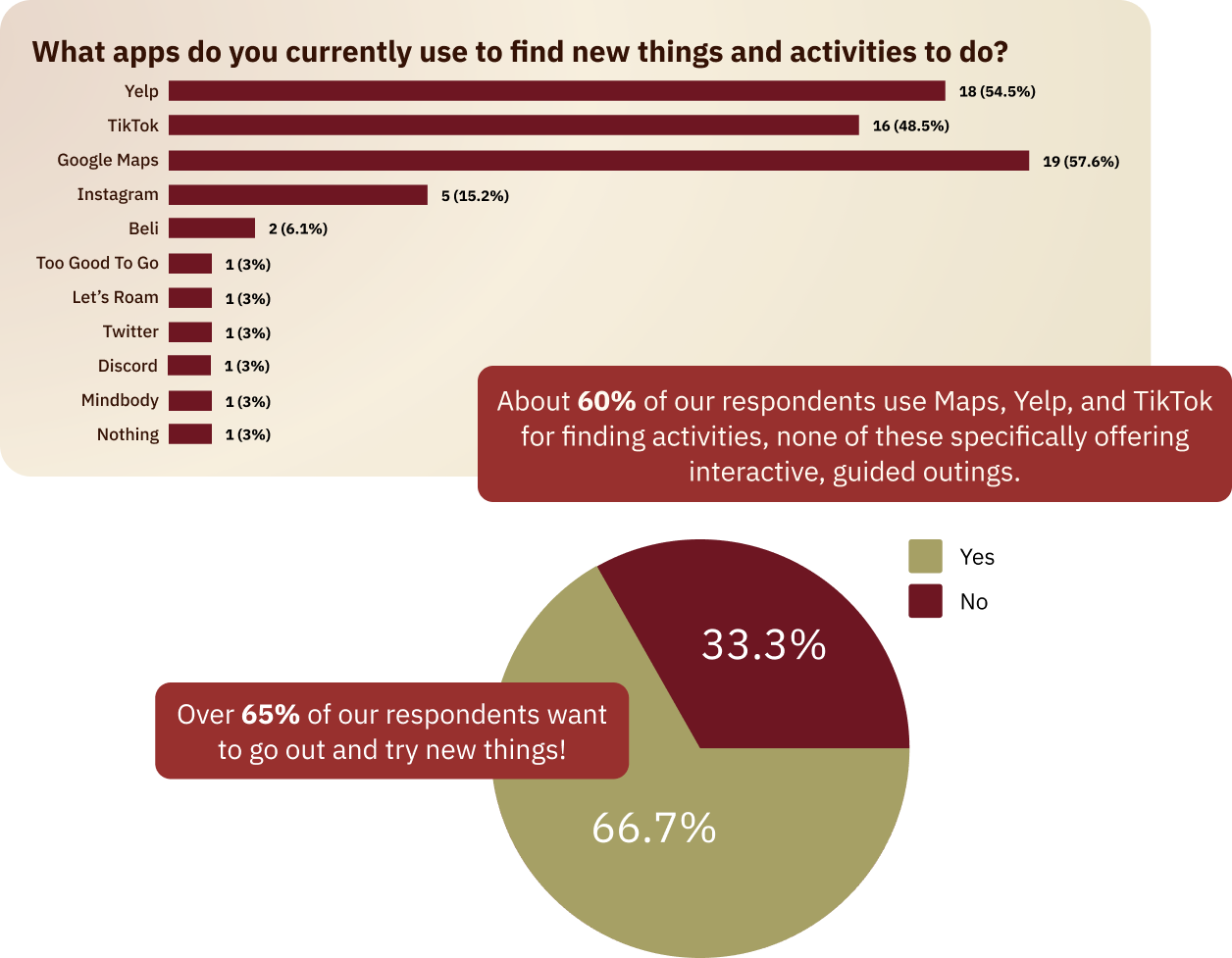We surveyed 33 participants about how they currently discover activities and plan outings. About 60% relied on Google Maps, Yelp, or TikTok — none purpose-built for interactive, guided exploration. Over half said they genuinely wanted to get out and try new things more often but didn't have a clear path to act on it.